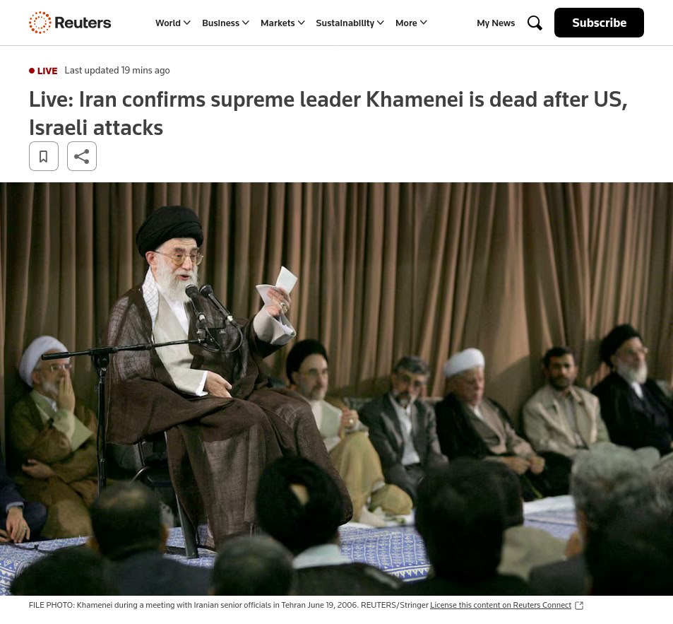 Сегодня днем появлялись сообщения о ликвидации Хаменеи, но они не были подтверждены. Вечером высокопоставленные лица в Израиле стали заявлять, что он ликвидирован и опознан, и вот теперь Трамп написал о том, что эта тварь ликвидирована. Без веских причин он бы такое, надеюсь, не написал.