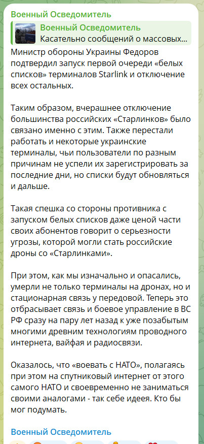 Судя по всему, Маск действительно отключил армии РФ связь Starlink: как я понял, теперь работают только терминалы Starlink из белого списка, куда включают терминалы, используемые ВСУ, и не включают терминалы армии РФ.