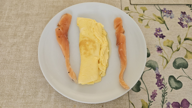Но мне нравится к такому омлету взять пару кусочков семги домашнего засола. И сочетается отлично, и как раз белков добить до нормы, а то два яйца - это всего 15 г белка, а надо 30.