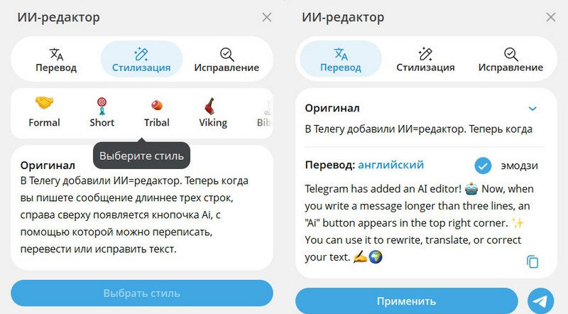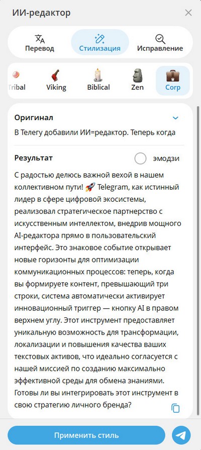 В Телегу добавили ИИ=редактор. Теперь когда вы пишете сообщение длиннее трех строк, справа сверху появляется кнопочка Ai, с помощью которой можно переписать, перевести или исправить текст.
