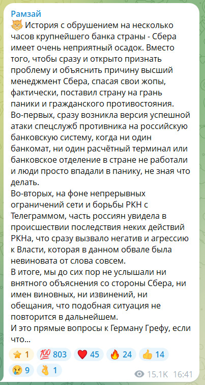 Сейчас пошла новая волна: на всяких z-гнид то ли надавили, то ли баблеца им подкинули, и теперь z-гниды разгоняют телегу о том, что в сбое виноват Сбер, а не Роскомговно с его роскомговняными блокировками - вот один из характерных примеров.