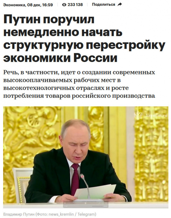 «Прошу приступить к его реализации незамедлительно, чтобы в конце следующего года сформулировать платформу для выхода темпов роста отечественной экономики не ниже мировых», — сказал Путин.