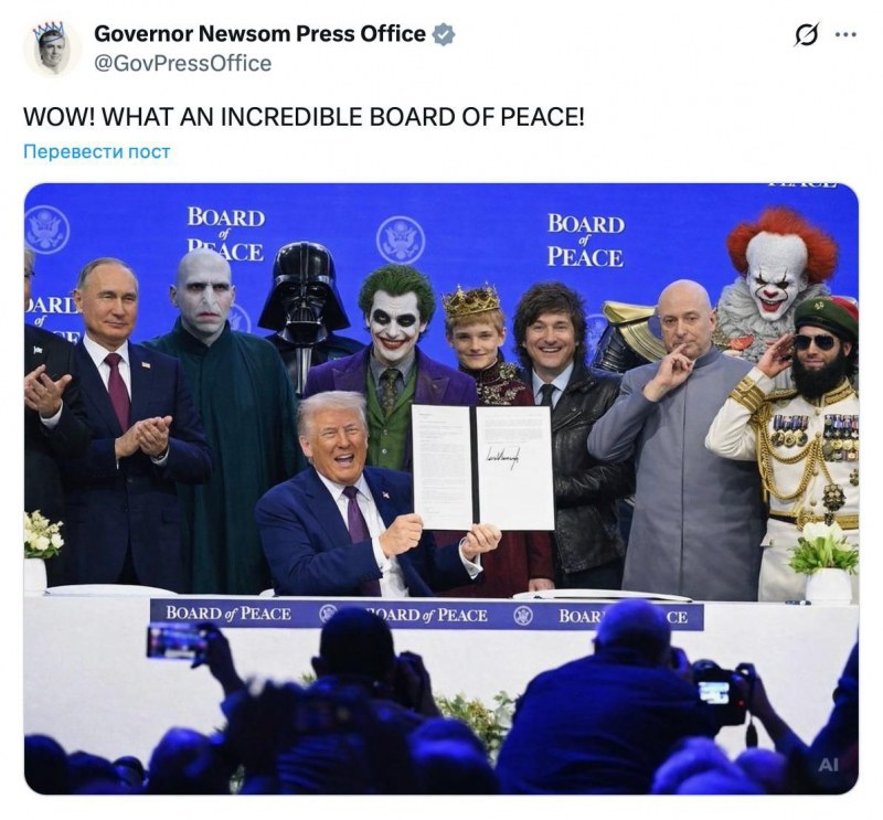 Ну что, в Давосе Трамп провел церемонию утверждения "Совета мира" имени Трампа, которым руководит Трамп, куда приглашает к участию Трамп, и где все решения принимаются большинством голосов при условии, что это утвердит Трамп. А если не утвердит, то решение не принимается. Если же есть решение Трампа, то большинство голосов уже не требуется, потому что это "Совет мира" Трампа.