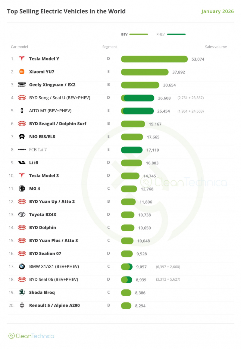 Тем не менее, этого хватило, чтобы обеспечить комфортное преимущество в 15 000 единиц над моделью, занявшей второе место, где нас ждал сюрприз — серебро завоевала Xiaomi YU7! Подиум замкнула Geely Xingyuan (EX2 на экспортных рынках) с почти 31 000 регистраций, что на 9% больше, чем в январе 2025 года.
