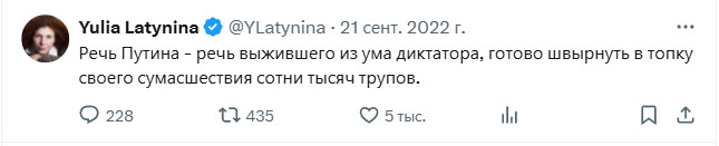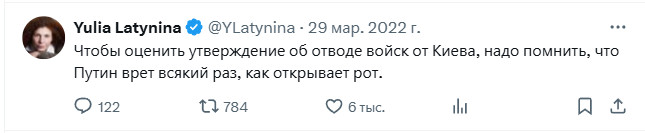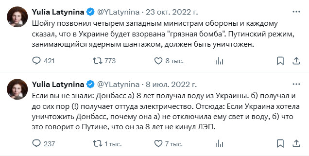 Я тут зашел в ее Твиттер не залогинившись. И обнаружил, что мне движок сверху почему-то показывает ее старые посты весны-лета 2022 года. И, знаете ли, так удивительно это все читается на фоне ее нынешних фееричных заявлений - это что-то!