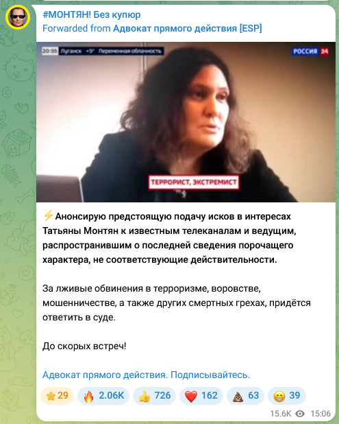 Помните мы недавно обсуждали чудесный жабогадюкинг: z-блогерку Татьяну Монтян в РФ внесли в перечень "террористов и экстремистов", а она работала на Рашку Тудей, выступала на федеральных каналах и на своем телеграм-канале собирала деньги для "ихних" мальчиков.