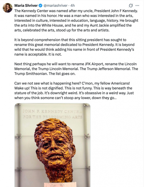 Только что мне сообщили, что уважаемый совет директоров Кеннеди-центра, в который входят некоторые из самых успешных людей со всего мира, только что единогласно проголосовал за переименование Кеннеди-центра в Трамп-Кеннеди-центр в связи с невероятной работой, проделанной президентом Трампом за последний год по спасению здания. Не только с точки зрения его реконструкции, но и с финансовой точки зрения, а также с точки зрения его репутации. Поздравляю президента Дональда Дж. Трампа, а также поздравляю президента Кеннеди, потому что это будет действительно великолепная команда на долгие годы! Здание, без сомнения, достигнет новых высот успеха и величия.