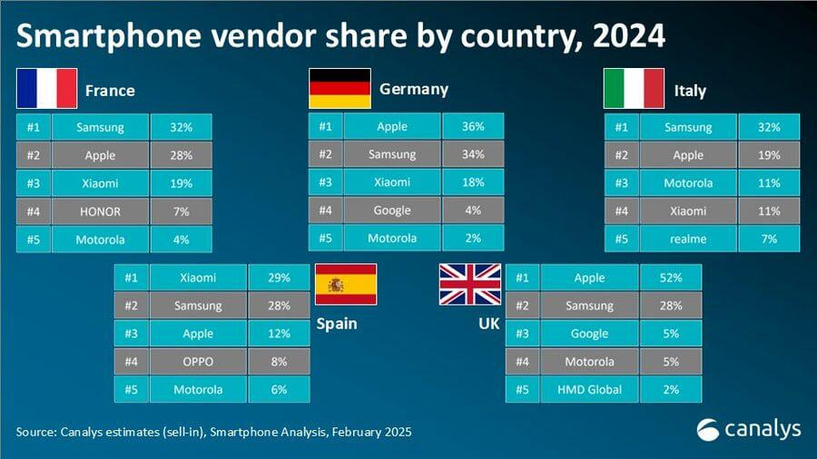 Интересная статистика по продажам марок смартфонов в некоторых европейских странах по производителям.