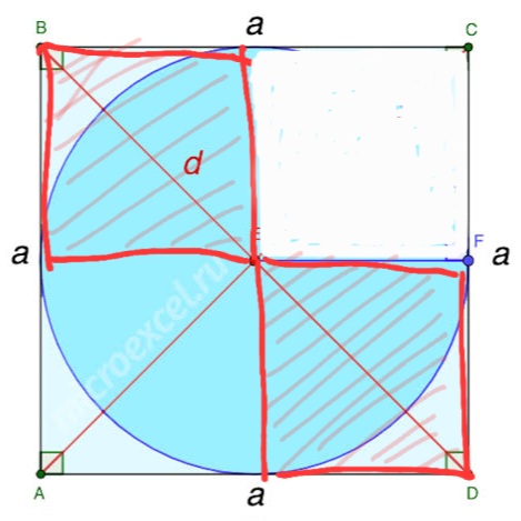 Вон чуть выше картинка. Площадь чего больше — половины квадрата и трех секторов круга?