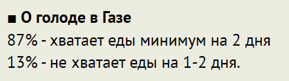 А по поводу голода в Газе - не верю. Точнее, не верю не в голод - хрен его знает, что там Хамас устраивает - а в отсутсвие достаточного количества продуктов в Газе.