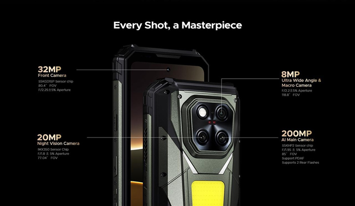 Будь то захватывающий дух пейзаж или ночная инспекция рабочей площадки, V Max LR всегда к вашим услугам. Его основная камера на 200 Мп снимает каждую деталь с потрясающей четкостью, а объектив ночного видения на 20 Мп обеспечивает четкие изображения даже в полной темноте. Переключитесь на сверхширокоугольную камеру на 8 Мп для съемки обширных сцен или используйте фронтальную камеру на 32 Мп для четких видеозвонков и селфи на ходу. От яркого дневного света до черной как смоль ночи — ваша история останется кристально чистой.