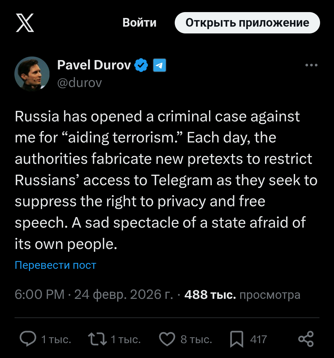 За последние пару дней сразу в двух крупных федеральных изданиях вышли статьи, в которых Telegram обвиняют во всех смертных грехах - мол, с его помощью подлые террористы совершают свои подлые террористические теракты. Против Павла Дурова возбудили уголовное дело "за содействие терроризму", и совершенно ясно, что со дня на день Telegram объявят "экстремистской организацией", как они уже объявили компанию Meta и Instagram.