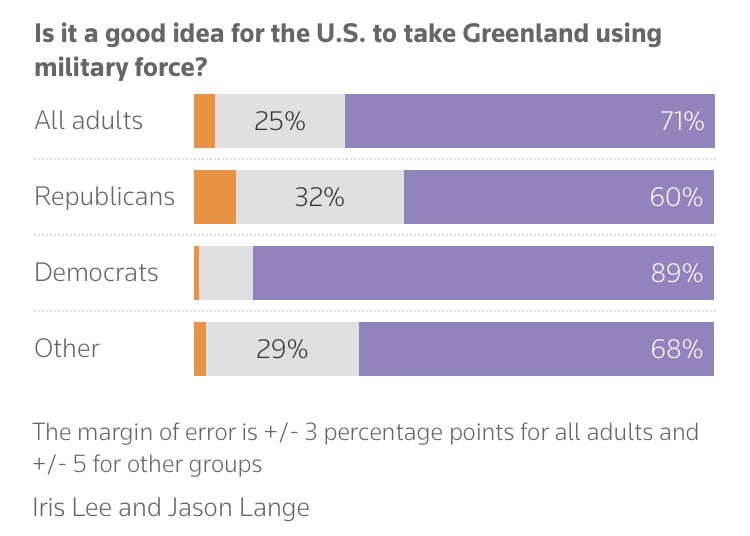 В военное вторжение США в Гренландию я не верю. Впрочем я еще 23 февраля 2022 года писал, что я не верю в военное вторжение россии в Украину. Но что США смогут отжать остров на каких-то условиях просто погрозив пальчиком вериться с каждым днем все больше. Было бы интересно наблюдать за этим цирком, если это не уводило фокус европейских стран от поддержки Украины.
