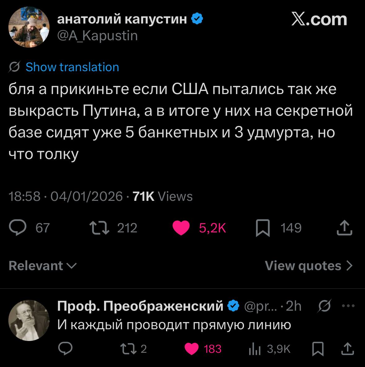 Кто-то, возможно, считает, что венесуэльская верхушка испугается произошедшего с Мадуро и будет склонна к компромиссам. Не думаю. Скорее всего, они будут не стоять, бояться, а фиксить баги, чтобы не допустить ничего похожего впредь. Успеху подобных операций, во многом, способствует эффект неожиданности. Когда же последний пропадает, провернуть такое становится уже намного труднее