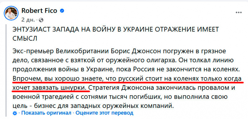 Очередное фееричное заявление этой путинской подстилки Фицо. Да-да, русские всегда завязывают шнурки, стоя на коленях. Знаете, это такая старая народная традиция.
