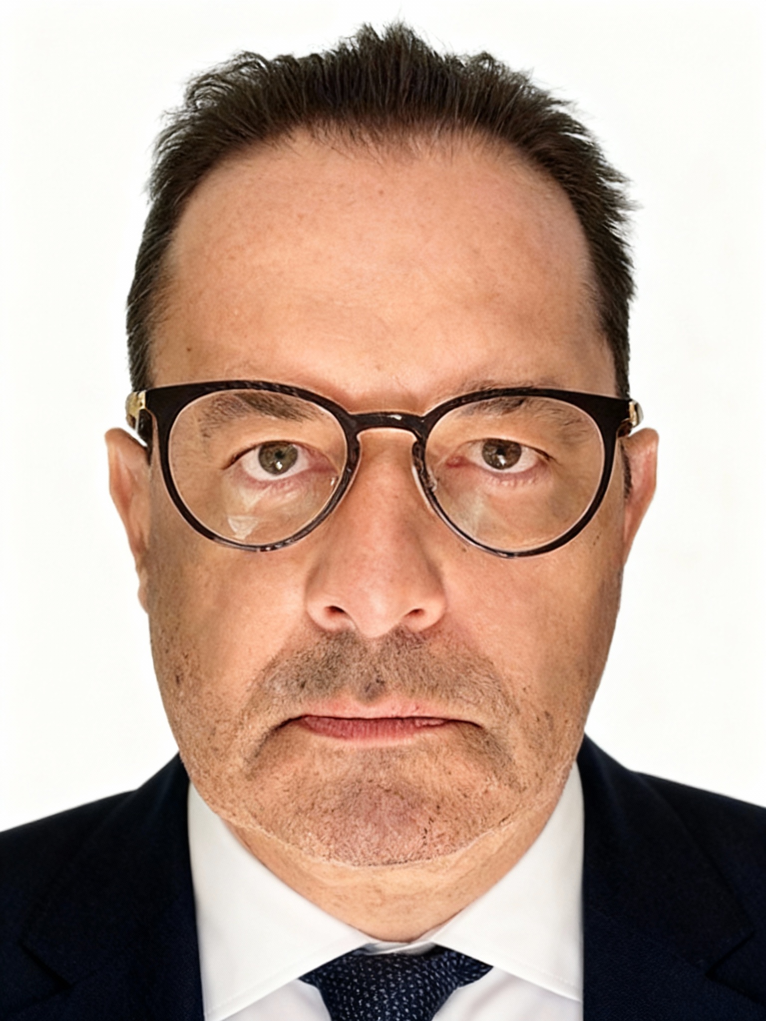 Промпт сделал такой: "Обрежь эту фотографию и сделай из нее мое фото на испанский паспорт, отвечающее всем соответствующим требованиям. Белый фон, костюм с галстуком, анфас".