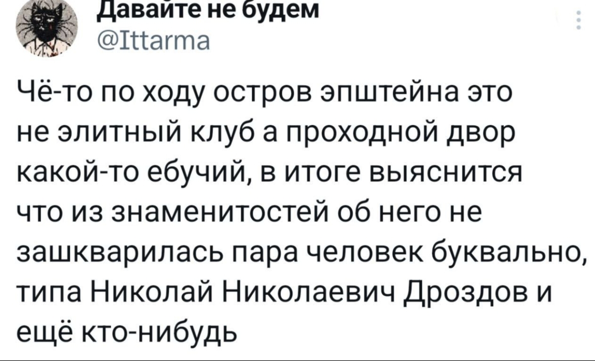 А что, понятие презумпции невиновности ушло в историю?Мне как-то, по наивности, казалось: трахал малолеток - суд, тюрьма (причём сам факт ещё доказать надо). Нет - отстаньте все, не ваше собачье дело, пусть Мелинда разбирается.А оказалось как? В коридоре сказал привет Эпштейну - всё, преступник и педофил. Удобно, красиво и доказывать ничего не надо....