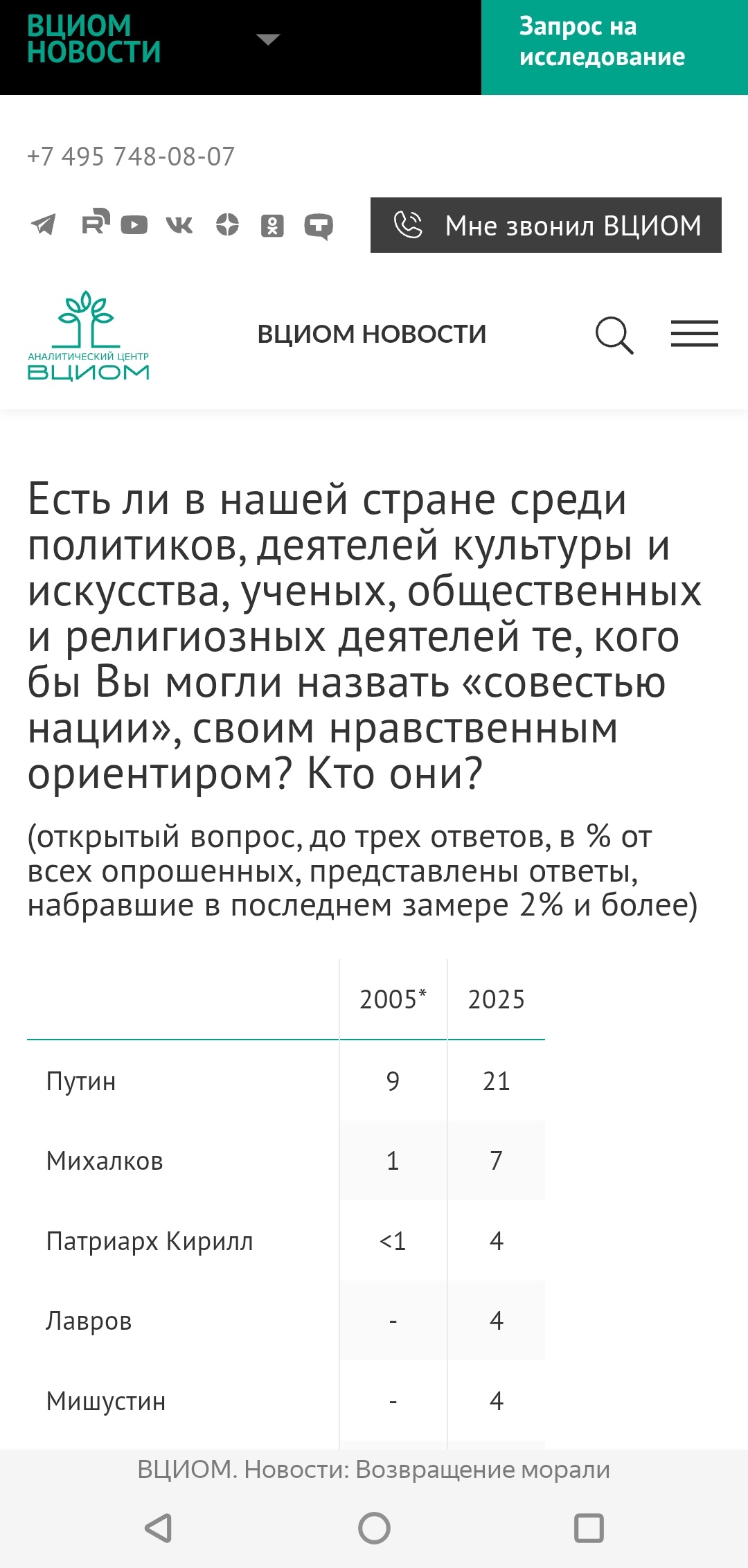 "Мораль и нравственность - категории, которые пронизывают все сферы человеческой жизни и формируют невидимую, но прочную основу любого общества, определяя границы дозволенного и выступая в качестве ключевого механизма регуляции социального поведения. <...> Особую роль в поддержании и транслировании ценностных ориентиров играют так называемые моральные авторитеты, в которых современное российское общество испытывает явный дефицит. <...> В частности, упоминаемость лидера народного рейтинга Владимира Путина за последние 20 лет выросла вдвое", - говорится в исследовании.