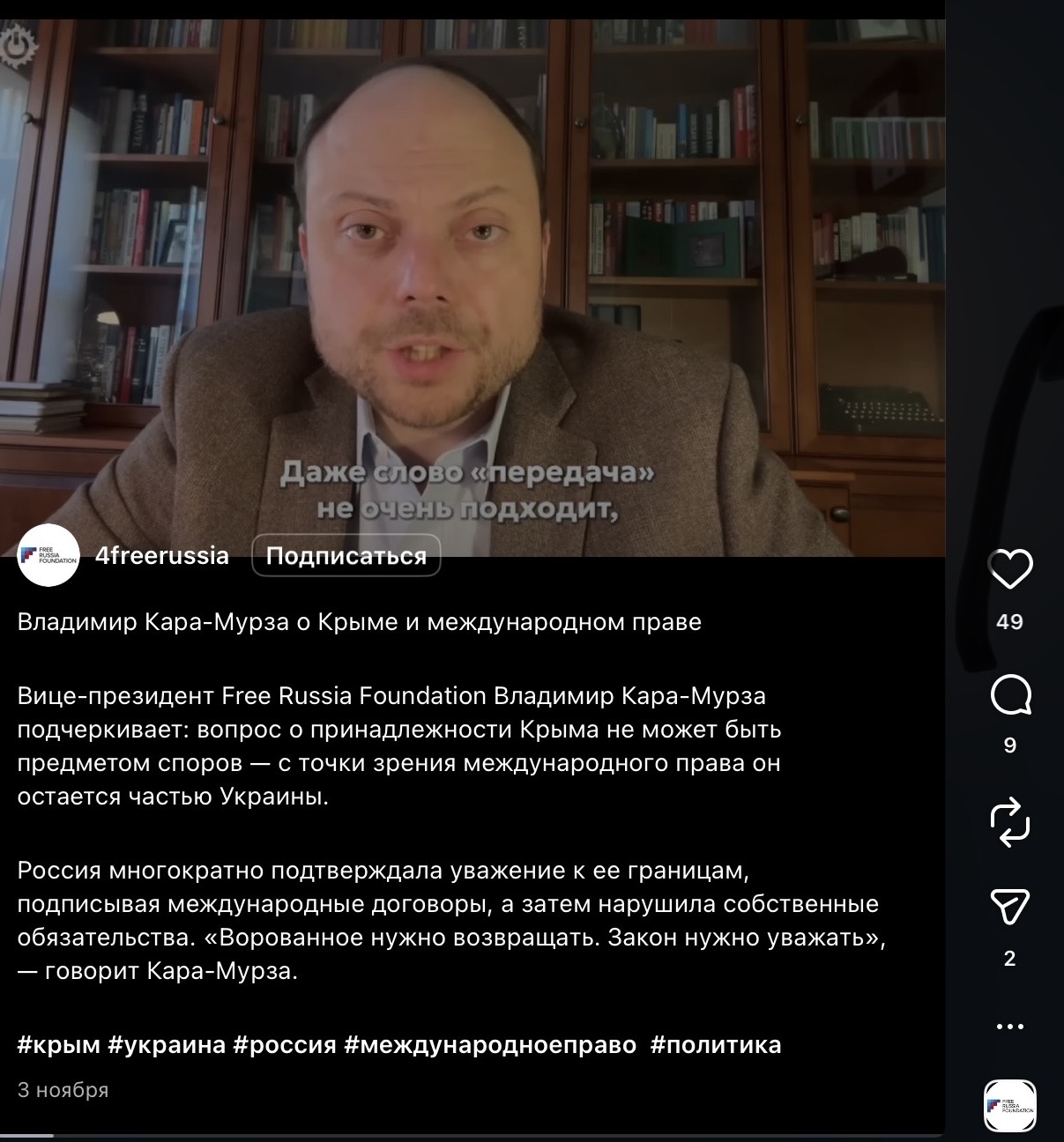 «Владимир Кара-Мурза последовательно занимает позицию, что Россия обязана вернуть Крым Украине, считая это единственным законным путем в рамках международного права, основанного на границах 1991 года, и осуждает аннексию 2014 года как несправедливость и нарушение обязательств. Он подчеркивает, что переговоры должны идти на условиях Украины, а любые соглашения, не предполагающие возвращения территорий, неприемлемы»