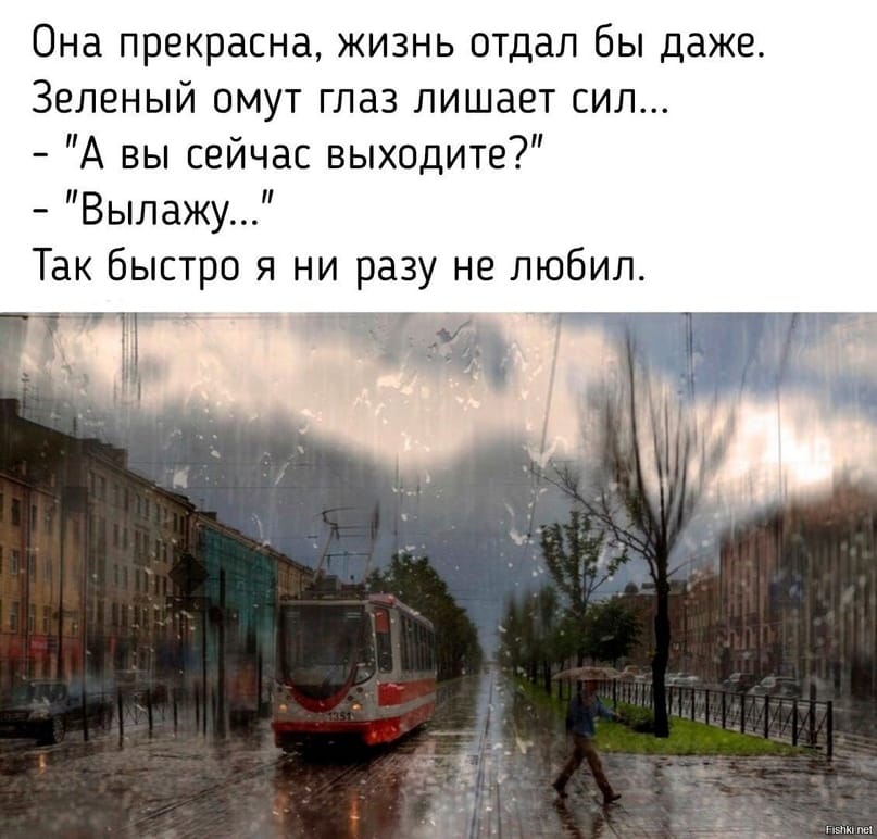 С той работы мне было ехать домой две остановки на трамвае - пять минут. Со мной зашёл (не заполз, нет) поддатый мужчина моих лет, секунд десять смотрел на стоявшую в трамвае даму, потом сказал ей "я тебя люблю" и ещё что-то, чего я уже не услышал.