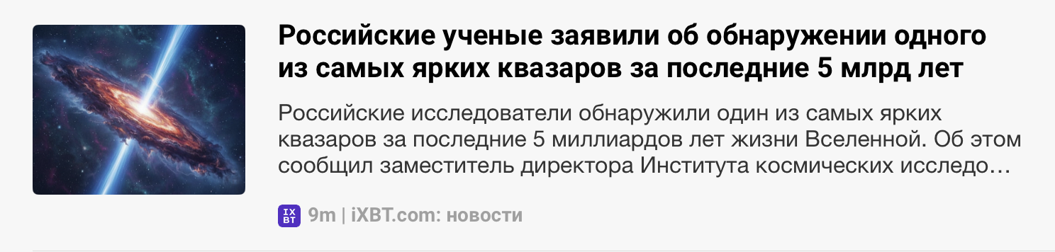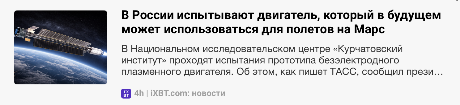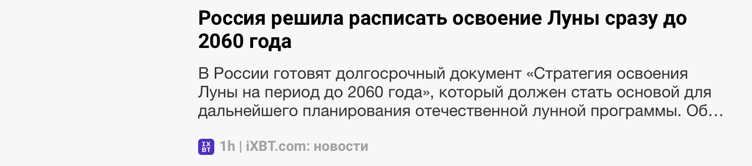 Но несколько дней назад ситуация резко изменилась. Новости про автомобили исчезли, вообще исчезли. Но в огромном количестве вместо них появились "новости" про космос в РФ- про будущие лунные станции, про космические ядерные реакторы, про российские открытия квазаров и т.д. Я наскринил заголовки только за сегодня что быстро нашёл.