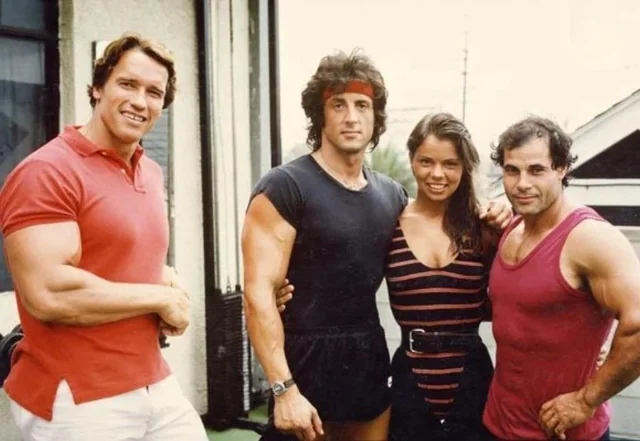 Нашел фото. Арнольд Шварценеггер, Сильвестр Сталлоне, Негрита Джейд и Франко Коломбо (бывший Мистер Олимпия), тренировка на пляже Венис, 1980-е годы.