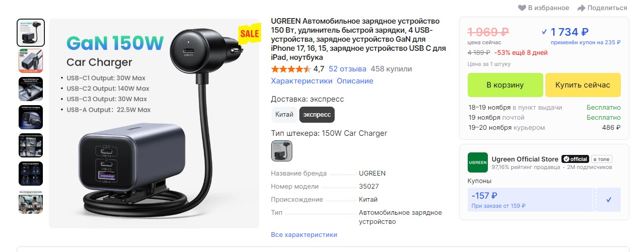 Скидка на зарядное устройство в виде робота Ugreen (65 Вт, с функцией быстрой зарядки), цена после применения купона — около 1600 рублей