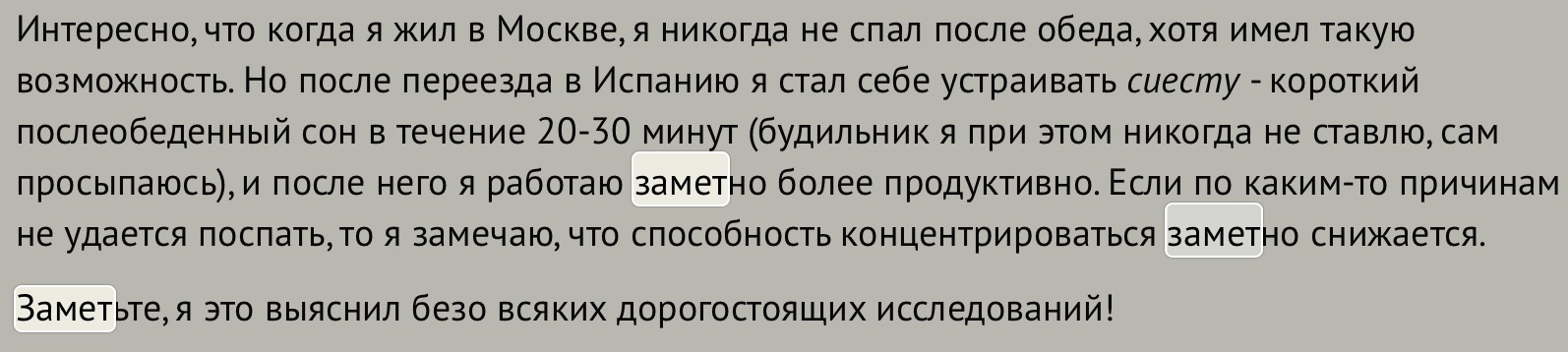 Интересно, что когда я жил в Москве, я никогда не спал после обеда, хотя имел такую возможность. Но после переезда в Испанию я стал себе устраивать сиесту - короткий послеобеденный сон в течение 20-30 минут (будильник я при этом никогда не ставлю, сам просыпаюсь), и после него я работаю заметно более продуктивно. Если по каким-то причинам не удается поспать, то я замечаю, что способность концентрироваться заметно снижается.