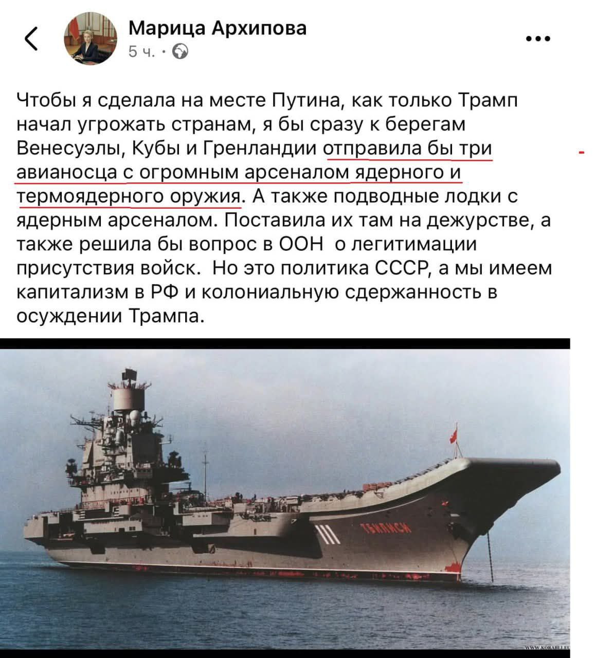 А что сделал Трамп? Заявил, что он уже "обо всем договорился" с вице-президентом Венесуэлы Делси Родригес, которая давняя подельница Мадуро, и у нее руки по локоть в крови точно так же, как и у самого Мадуро. То есть Трамп считает, что вся вертикаль власти, выстроенная Мадуро, без Мадуро вдруг начнет работать так, как ему, Трампу, надо? И с чего вдруг такая уверенность? Это все равно что похитить из РФ Путина, а потом заявить, что вся полнота власти там переходит к Патрушеву, и что он с Патрушевым "обо всем договорился".