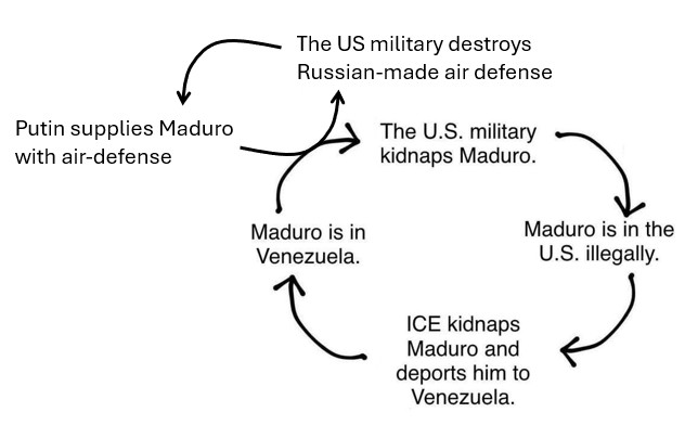 Вместо этого, они долгие месяцы гоняли флот вокруг Венесуэлы, топили лодки (якобы) с наркотиками, задерживали танкеры с нефтью... Это все зачем? Как это способствовало аресту Мадуро?
