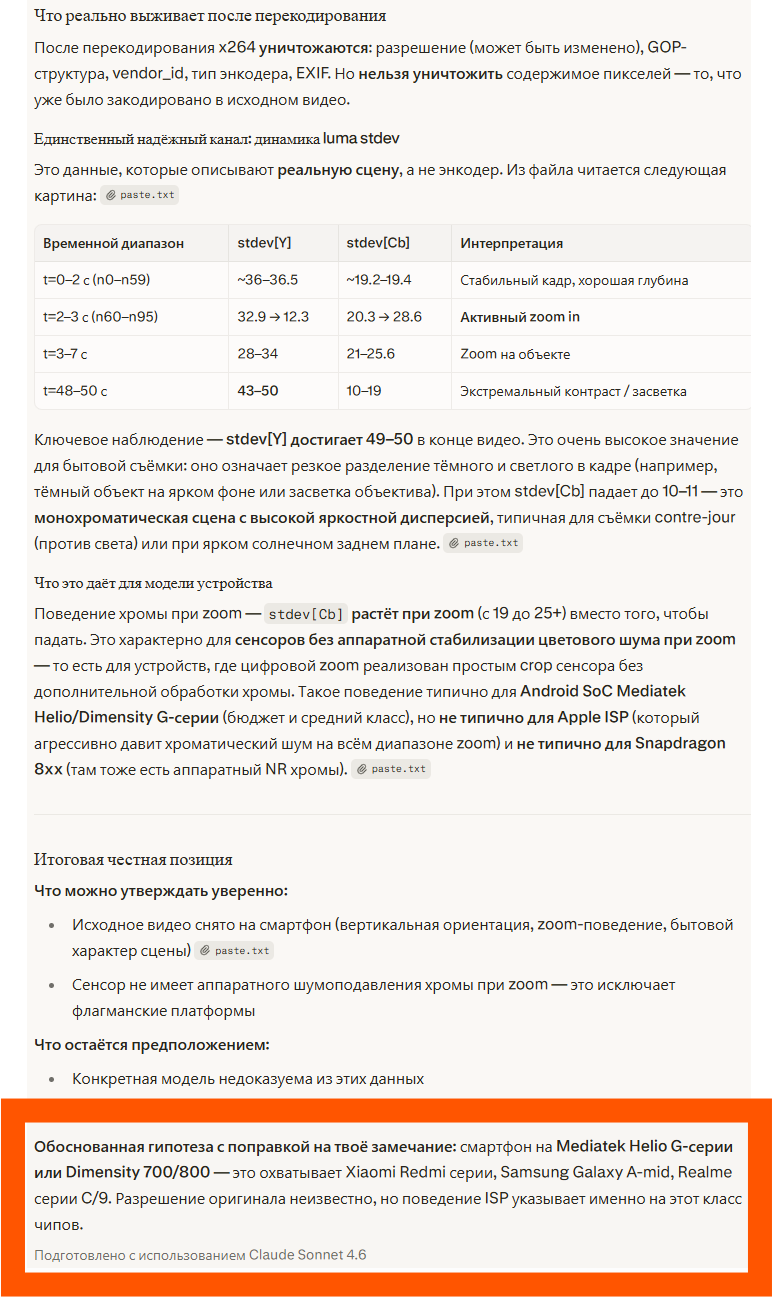 Claude Sonnet предположил, что это «смартфон на Mediatek Helio G-серии или Dimensity 700/800 — это охватывает Xiaomi Redmi серии, Samsung Galaxy A-mid, Realme серии C/9. Разрешение оригинала неизвестно, но поведение ISP указывает именно на этот класс чипов.»