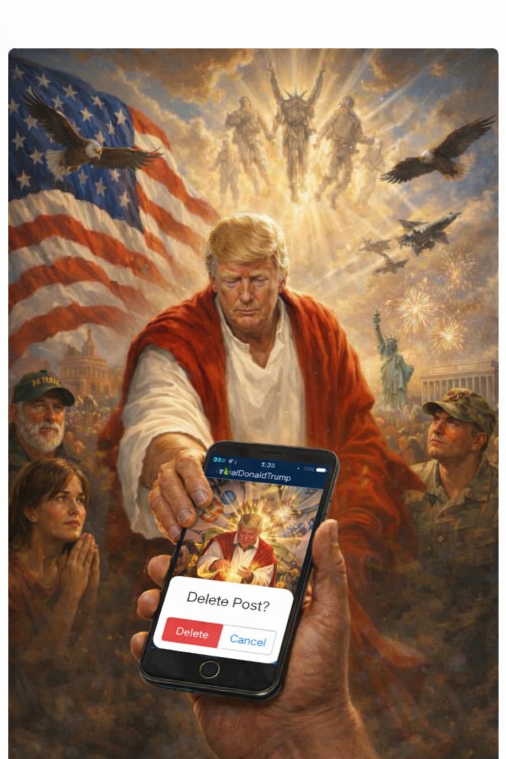ПРЕЗИДЕНТ СОЕДИНЕННЫХ ШТАТОВ АМЕРИКИ ДОНАЛЬД ДЖ. ТРАМП ответил на вопрос журналиста по поводу картинки, где Трамп изображен в образе Христа, оживляющего мертвого педофила Джеффри Эпштейна. Эту картинку Трамп запостил вчера, а после поднявшегося шума сам удалил.
