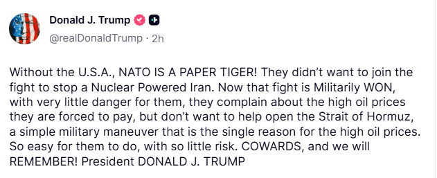 Без США НАТО — ЭТО БУМАЖНЫЙ ТИГР! Они не захотели присоединиться к борьбе за предотвращение появления Ирана, обладающего ядерным оружием. Теперь, когда эта борьба ВЫИГРАНА с военной точки зрения и практически не представляет для них опасности, они жалуются на высокие цены на нефть, которые вынуждены платить, но не хотят помогать в открытии Ормузского пролива — простого военного маневра, который и является единственной причиной высоких цен на нефть. Для них это так легко, с таким небольшим риском. ТРУСЫ, и мы это ЗАПОМНИМ! Президент ДОНАЛЬД ДЖ. ТРАМП
