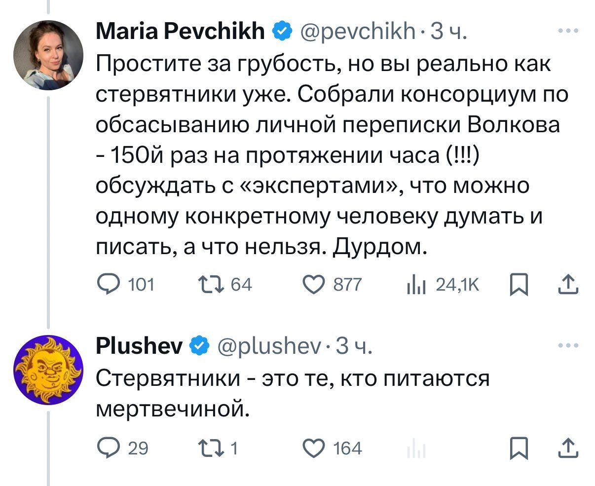 Милов также говорит о том, что "коллеги из ФБК проведут над этим работу", но тут, извините, уже 5 дней прошло с момента публикации Анны Тирон этой переписки, подлинность которой подтвердил сам Волков, а что у нас там по поводу этих потрясающих заявлений их руководителя сказали в ФБК? Ничего не сказали, ноль. Где там эта всегда такая активная Певчих, которая по любому поводу в кожанке и с маузером залезает на броневик? Нет ее, сгинула куда-то, молчит. За все это время только одна какая-то маленькая (в смысле должности) сотрудница ФБК робко написала, что она не понимает, почему руководство молчит по этому поводу - Саша Плющев ее пост цитировал в своем ТГ. И всё!