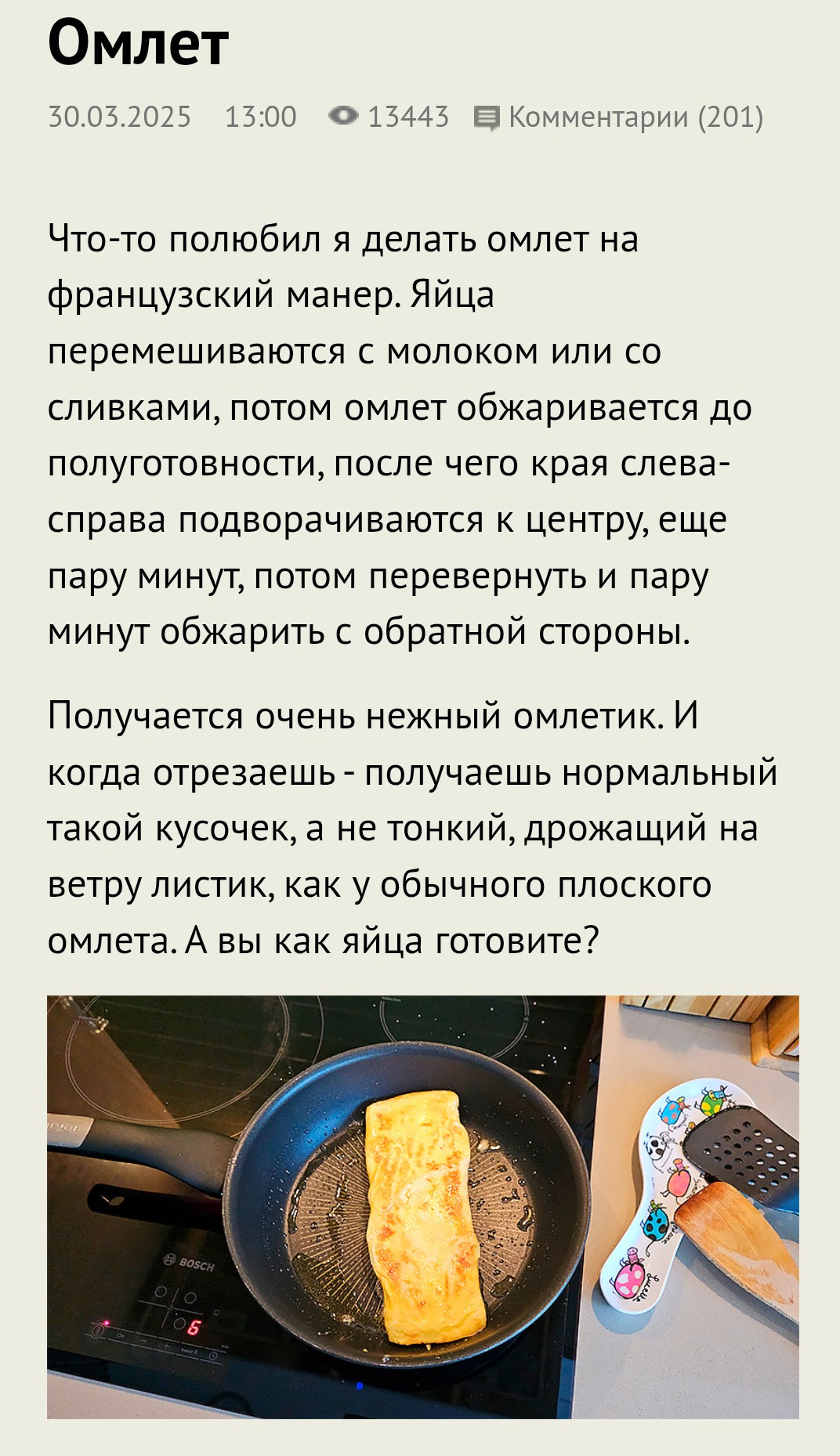 А еще он показал вариант с отделением желтка от белков, желтки готовятся как обычный омлет, белки взбиваются в плотную массу, потом ее заворачивают в омлет, нарезаются и получается омлет-роллы. Можно украсить темной подливкой и икрой. Тут я понял что голоден и пошел на кухню 😄