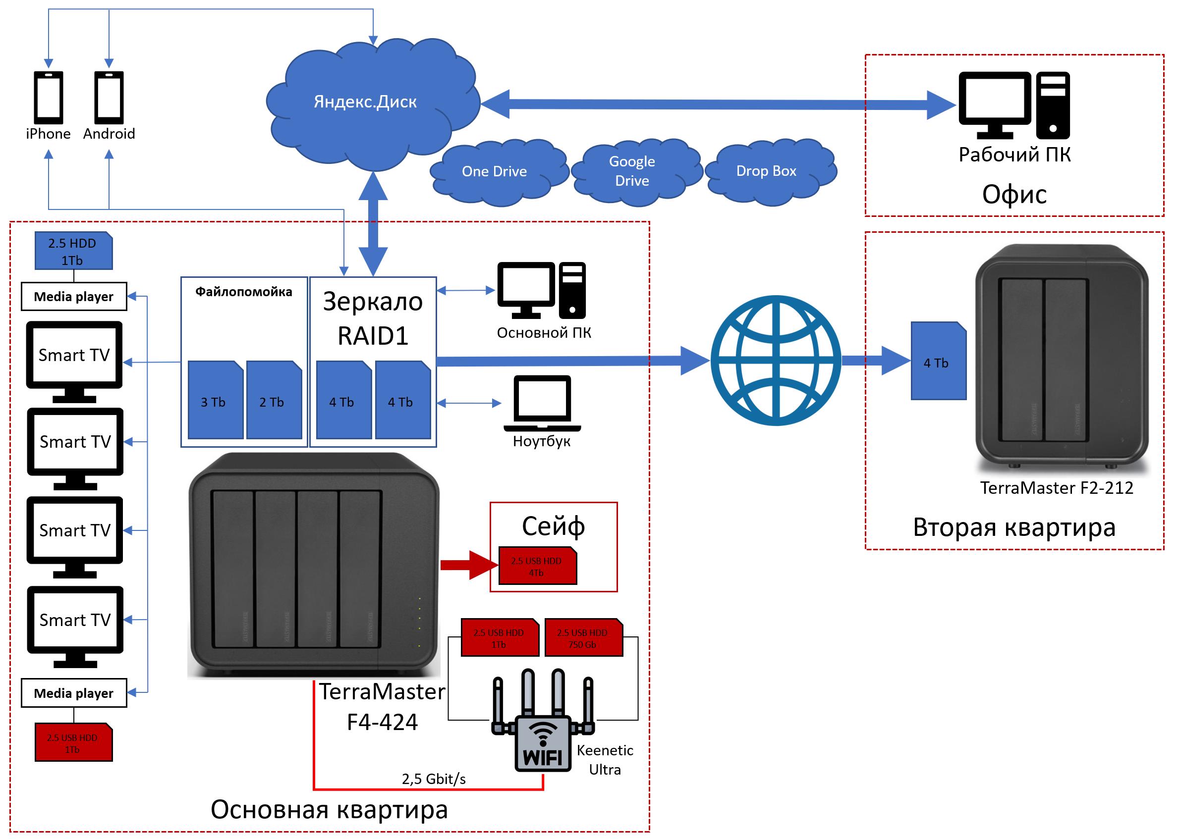 Вот до такой схемы я в данный момент дошёл у себя дома. Итого, получается, у меня 5 копий важных для меня данных на разных носителях и в разных местах.