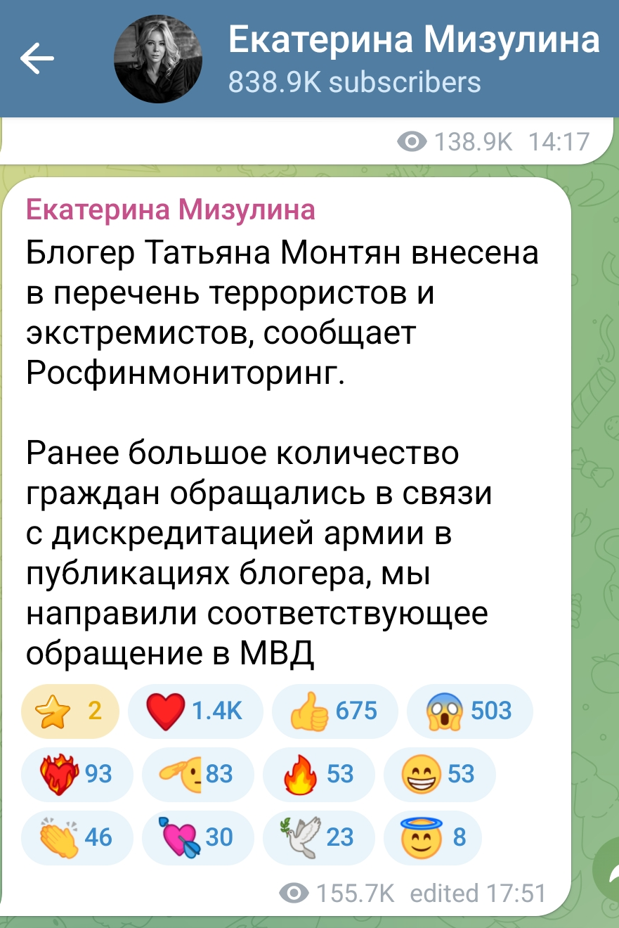 Помните мы недавно обсуждали чудесный жабогадюкинг: z-блогерку Татьяну Монтян в РФ внесли в перечень "террористов и экстремистов", а она работала на Рашку Тудей, выступала на федеральных каналах и на своем телеграм-канале собирала деньги для "ихних" мальчиков.