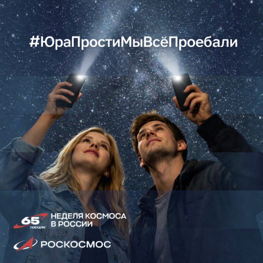 А к 65 годовщине полета Гагарина они придумали гениальную акцию: в течение недели перед 12 апреля нужно поднять взгляд к небу, смартфон направить вверх, включить вспышку или фонарик, заснять себя в этой максимально идиотской позе и опубликовать в соцсетях с хештэгом #ВотТакойЯМудак #ВремяГагарина #ЗаЗвездами.