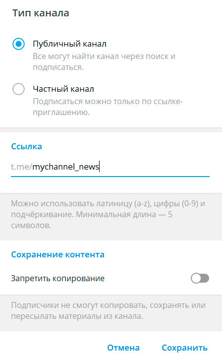 Нажимаете "Создать группу", даете ей какое-то название, после этого открывается окно с данными созданного канала. И вот там есть один очень важный момент - тип канала.