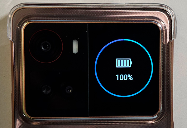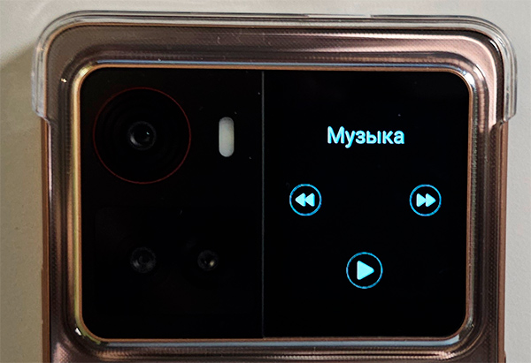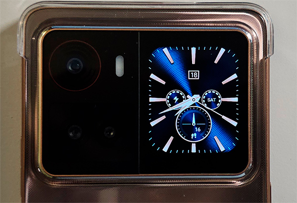 Здесь также есть второй, задний дисплей, расположенный рядом с блоком камер. На него могут выводиться циферблаты, уведомления, музыкальный плеер, всякие другие виджеты.