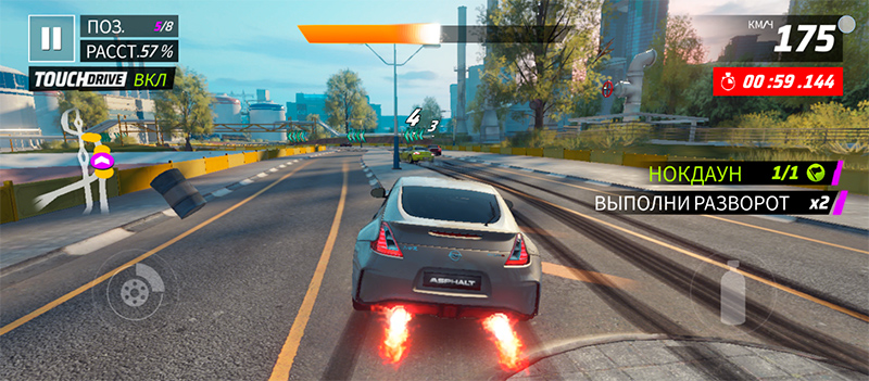 Asphalt Legends на максимальных настройках, но с 30 FPS катался плавно, FPS не проседал.
