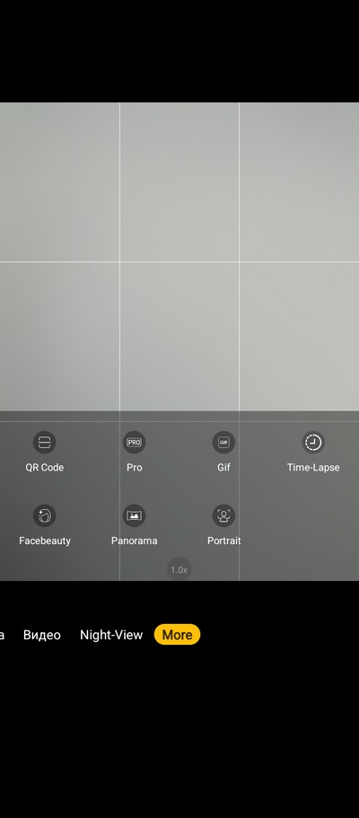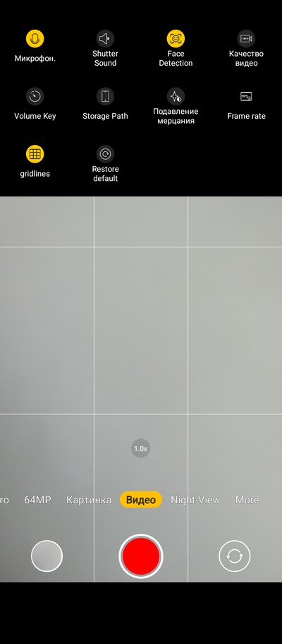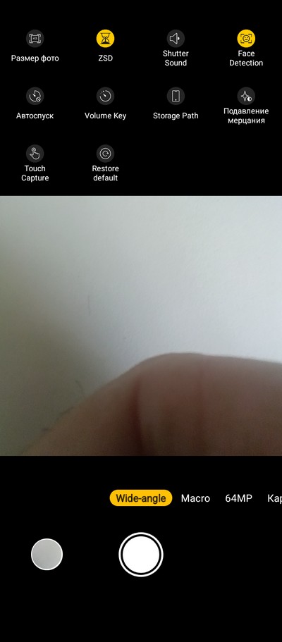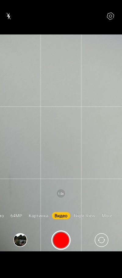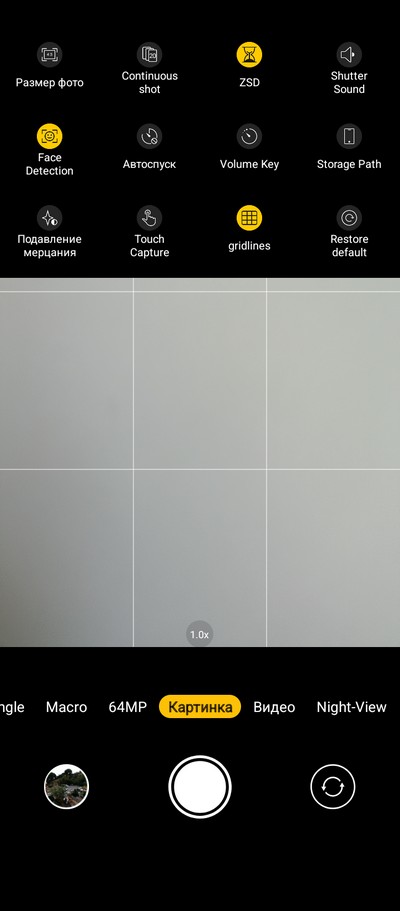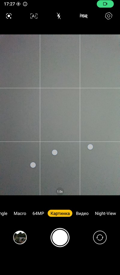 Интерфейс камеры. Снизу переключаются режимы. Сверху - пиктограммы различных переключателей.  На правом скриншоте - окно меню с настройками. Для сверхширика предусмотрен отдельный режим (почему-то), а в режиме фото (это называется "Картинка") можно переключаться только между основной камерой и 2-кратным цифровым зумом.