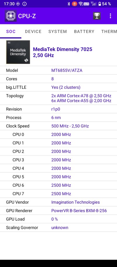 Процессор: Mediatek Dimensity 7025 (6 nm), Octa-core (2x2.5 GHz Cortex-A78 & 6x2.0 GHz Cortex-A55)