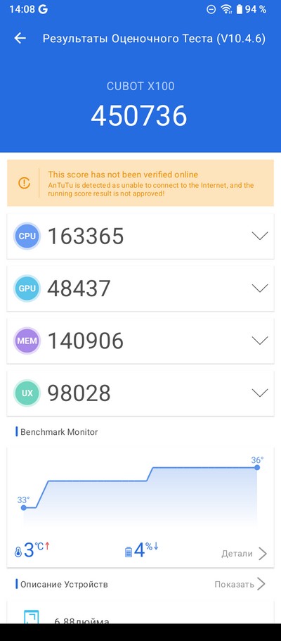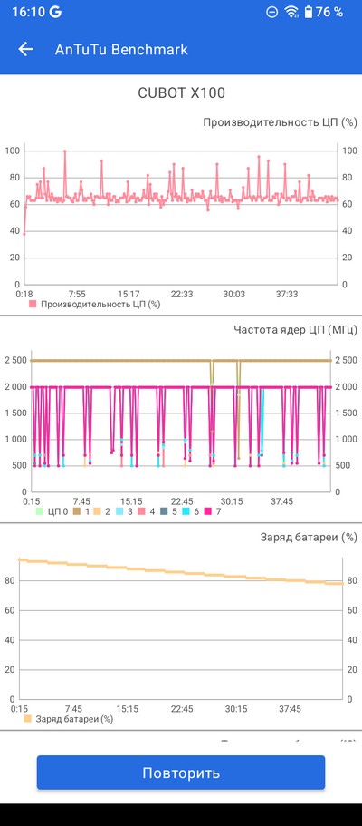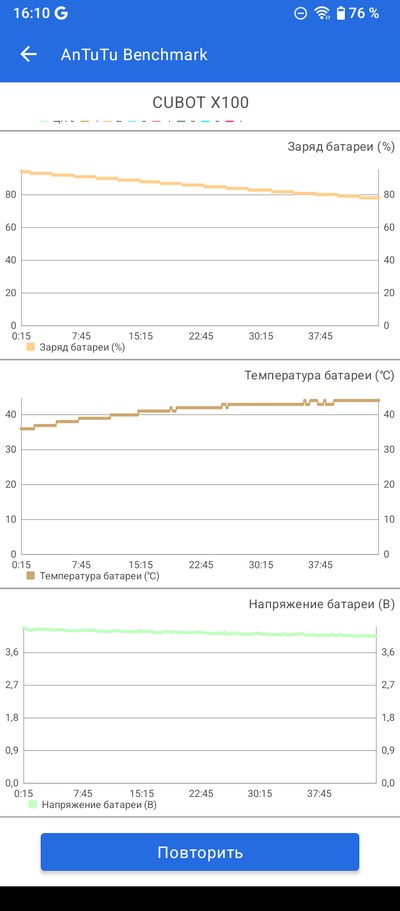 Стресс-тест AnTuTu. Батарея нагрелась до 44 градусов.