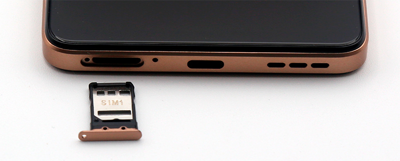 На нижней грани: слот под вставку с симкартками, микрофон, порт Type-C, прорези над стереодинамиком. Второй стереодинамик располагается на верхней грани.