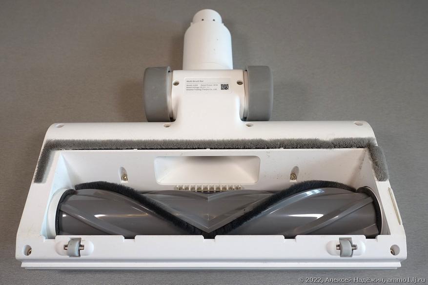 Сзади расположена комбинированная емкость для мусора и там же контейнер для воды. В центре - два колеса и турбощетка, ближе к передней части круговая щетка и вращающееся в вертикальной и горизонтальной плоскости колесо.