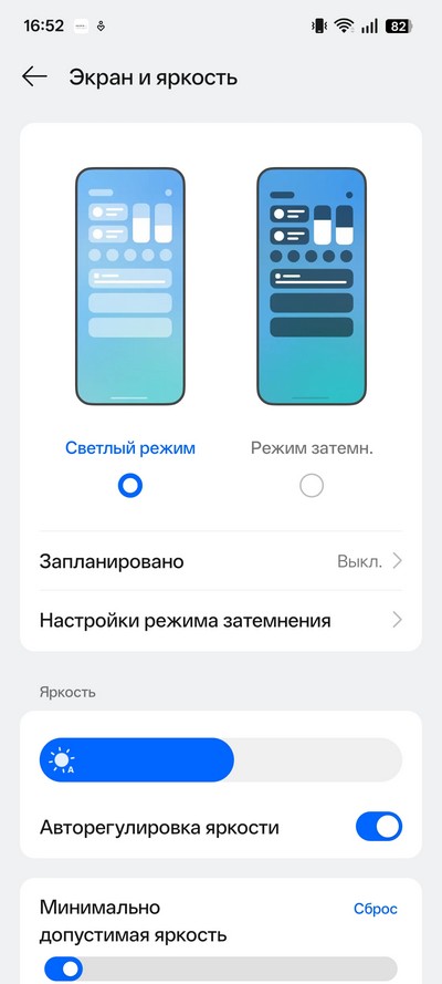 В настройках экрана есть темный режим, режим чтения, можно настраивать размер шрифта и масштаб. Частота обновления может подбираться автоматически, а может задаваться вручную.