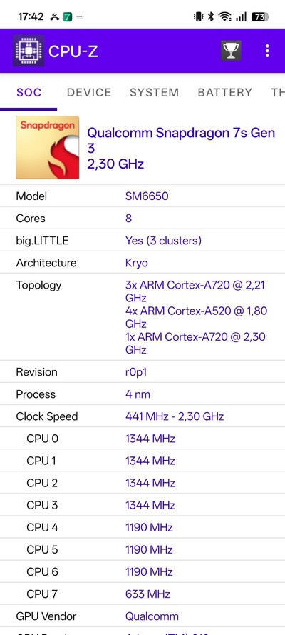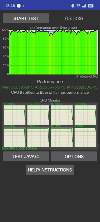 Тест на троттлинг. Падения производительности практически нет вообще. А, кстати, процессор Qualcomm Snapdragon 6 Gen 4 в других смартфонах имел проблемы с нагревом, и там троттлинг наблюдался - производителю приходилось устанавливать ограничения для процессора. Но здесь, как я читал, установлена эффективная испарительная камера, которую раньше ставили вообще только во флагманы, так что и нагрева заметного нет, и производительность не падает.