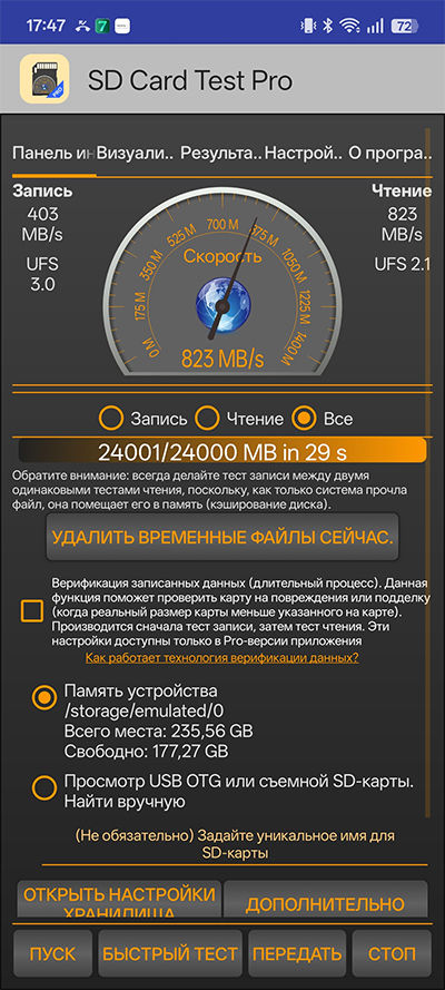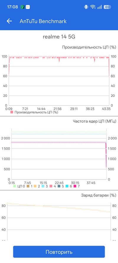 Стресс-тест AnTuTu. Производительность вообще не падала, нагрев батареи не превысил 40 градусов.