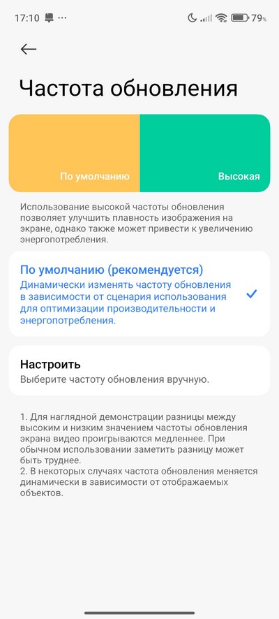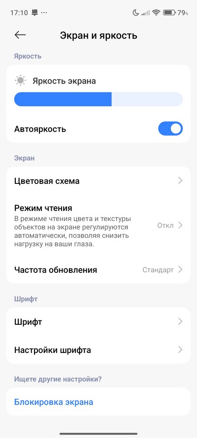 Настройки экрана - стандартные для Hyper OS. Есть темный режим, режим чтения, можно настраивать размер шрифта и масштаб. Частота обновления может подбираться автоматически, а может задаваться вручную.